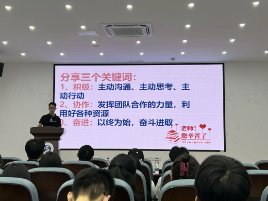 会上,张俊锋老师为同学们提供了研究生阶段的学习方法和策略,详细讲解了研究生学业政策、奖助学金及评优体系,并建议同学们要做好知识管理、社交管理、时间管理、实践管理,积极主动,深入学习,团结协作,培养创新思考和实践能力,不断奋斗进取,以坚定的信念和不懈的努力,在研究生学习中脱颖而出。
